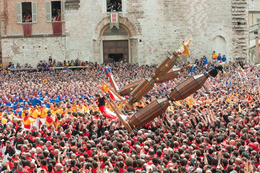 Si tiene il 15 Maggio in onore del Santo Patrono Ubaldo la cui festa patronale è il giorno seguente. Tre grandi macchine a spalla con in cima i santi delle statuette dei santi di Sant’Ubaldo, San Giorgio e Sant’Antonio vengono portate a spalla per le vie del centro storico fino alla basilica. L’importanza della festa è testimoniata dalla presenza dei tre ceri sullo stemma della regione.